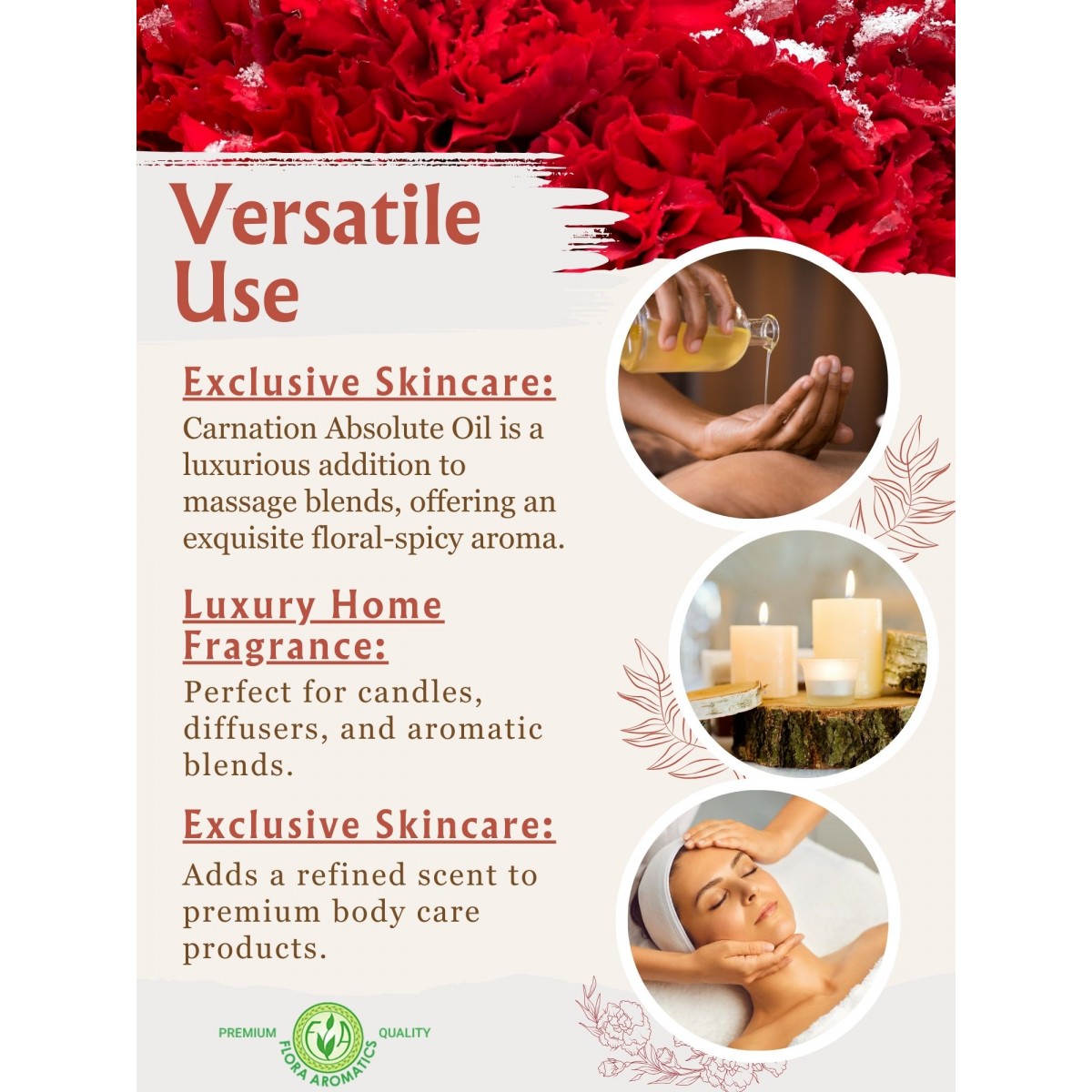 In high-class perfumery, Carnation Absolute is mostly used to modify a fragrance to provide warm spicy floral nuances, especially for classic men's fragrances. Carnation Oil also has anti-inflammatory properties, as well as refreshing, moisturizing, and regeneration effects on the skin.