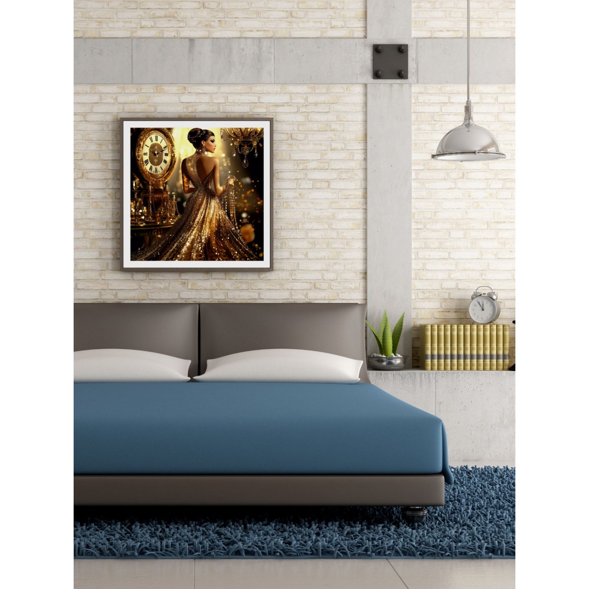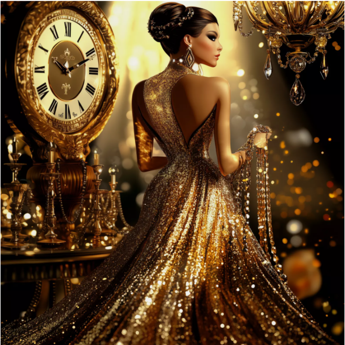 This painting radiates an aura of luxury and sophistication. It depicts a graceful woman in a sparkling gold evening gown, standing amidst elegant decor — antique clocks and a magnificent chandelier. Warm lighting creates a magical interplay of light, emphasizing the brilliance of the gown and the refinement of the setting.