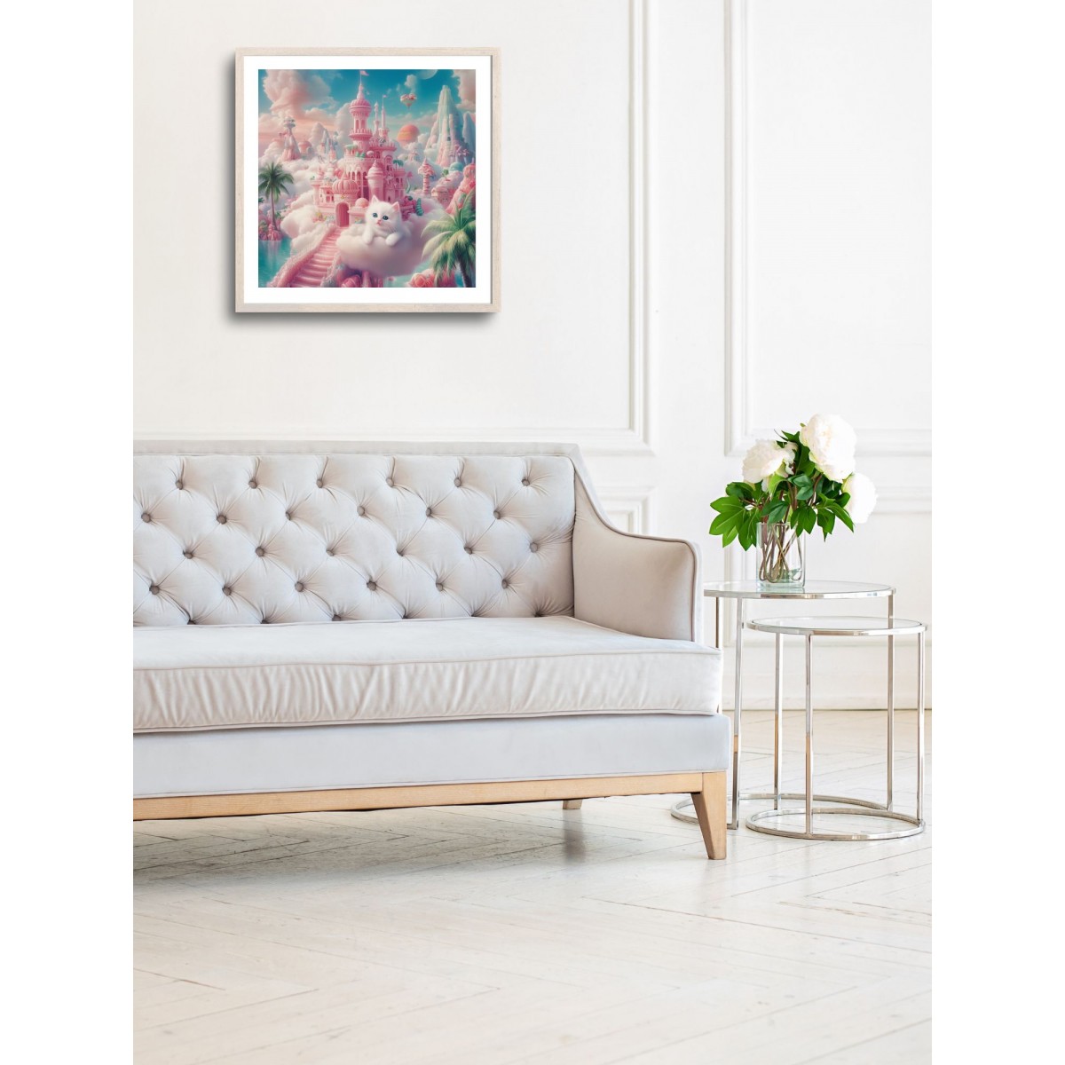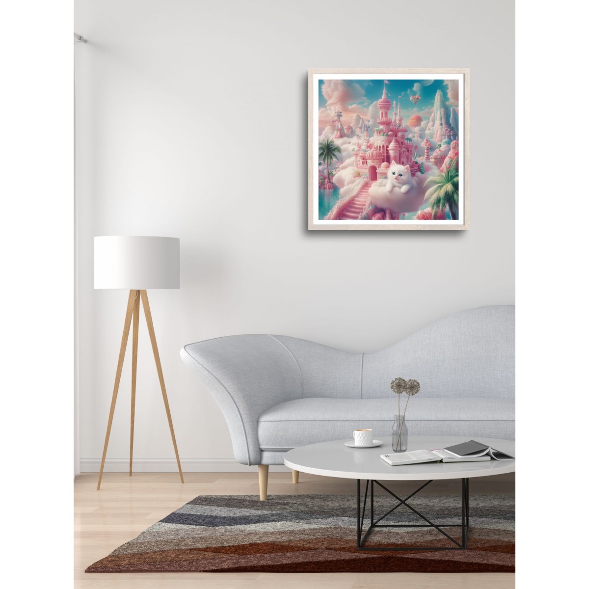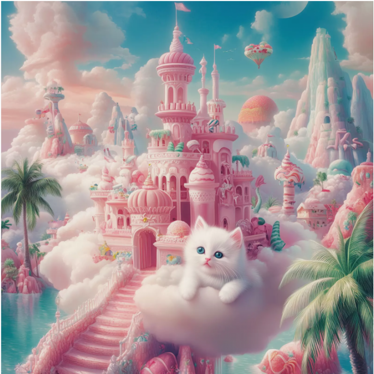 Kitten on a Cloud by a Fairytale Palace. A surreal art print measuring 40.6 x 40.6 cm, featuring a fluffy white kitten with blue eyes resting on a soft cloud in front of a fantastical pastel-toned palace. The fairytale architecture includes domes, staircases, and palm trees, all surrounded by clouds. The background showcases mountains, hot air balloons, and a bright blue sky. This print evokes a sense of tenderness, magic, and coziness, making it a perfect focal point for any interior.