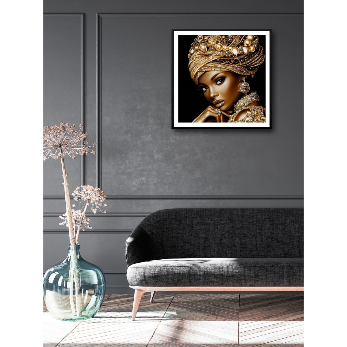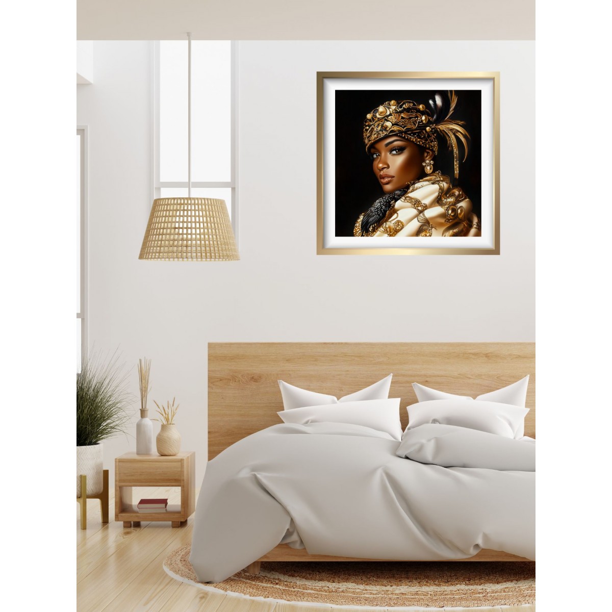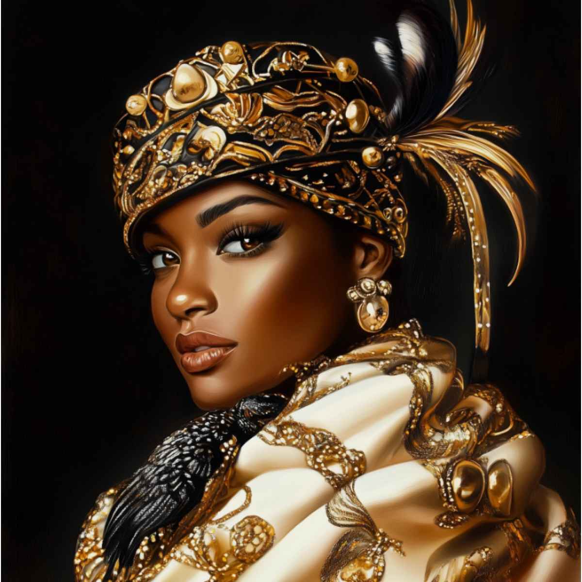 This painting showcases an exquisite portrait of a dark-skinned woman embodying royal elegance and luxury. Her headdress, adorned with golden details, precious stones, and delicate feathers, conveys an atmosphere of grandeur and refined taste. The flowing lines and rich texture of her attire highlight the luxurious modern style with elements of chic.